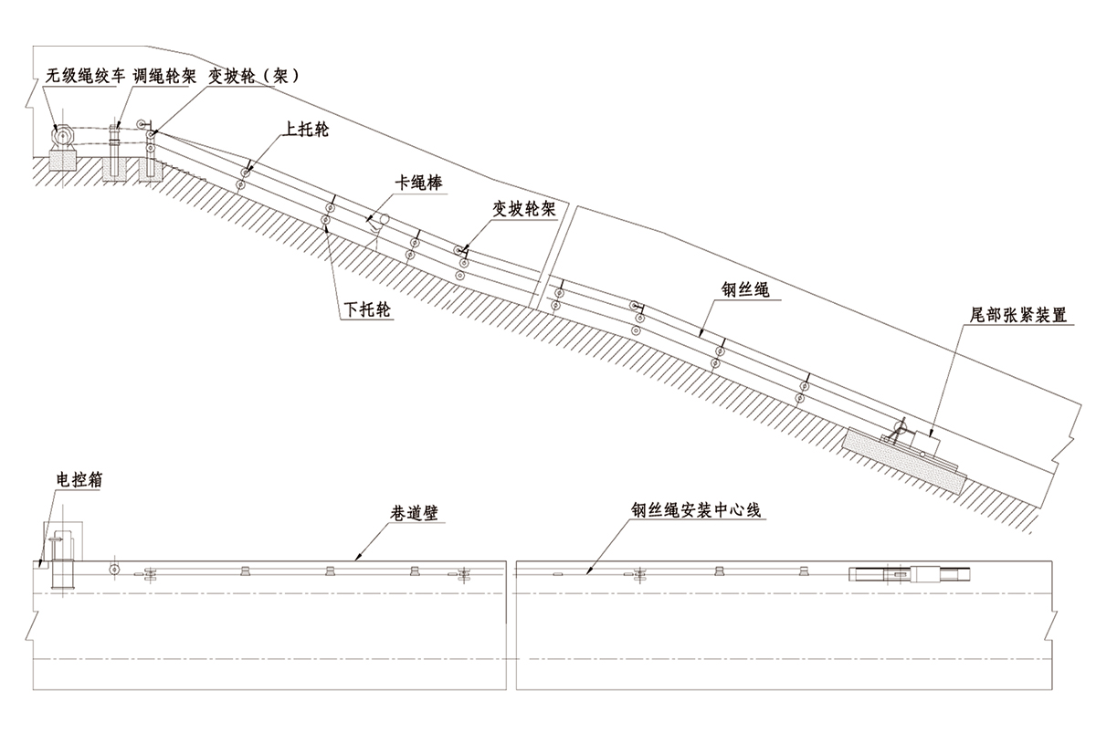 XYD型礦用斜巷行人助行器,適用煤礦井下大坡度(10°≤α≤30°)、短距離的巷道行人。鋼絲繩循環(huán)運轉,人員手握助行桿卡住鋼絲繩,被帶動跟隨上坡,以減輕工人的體力消耗。