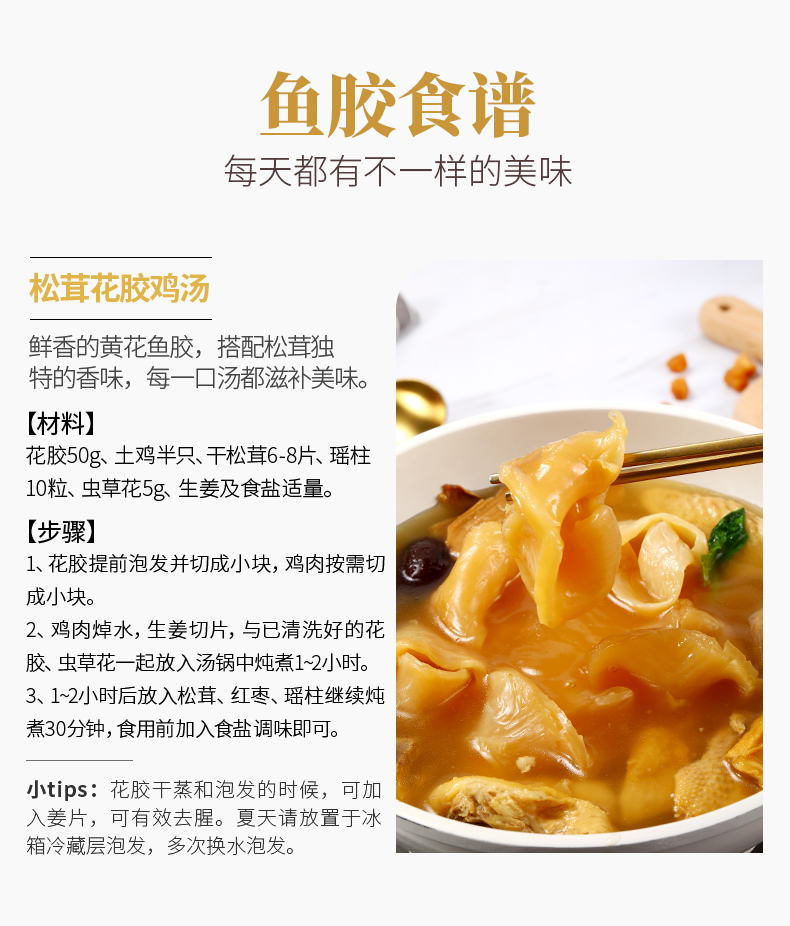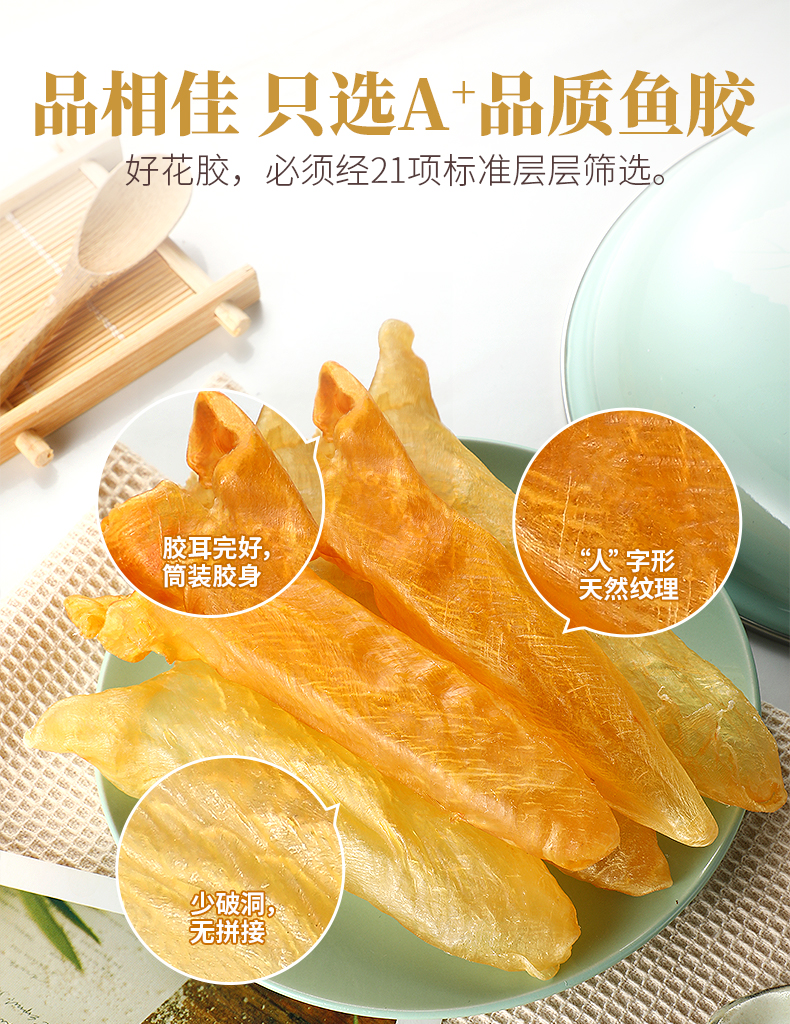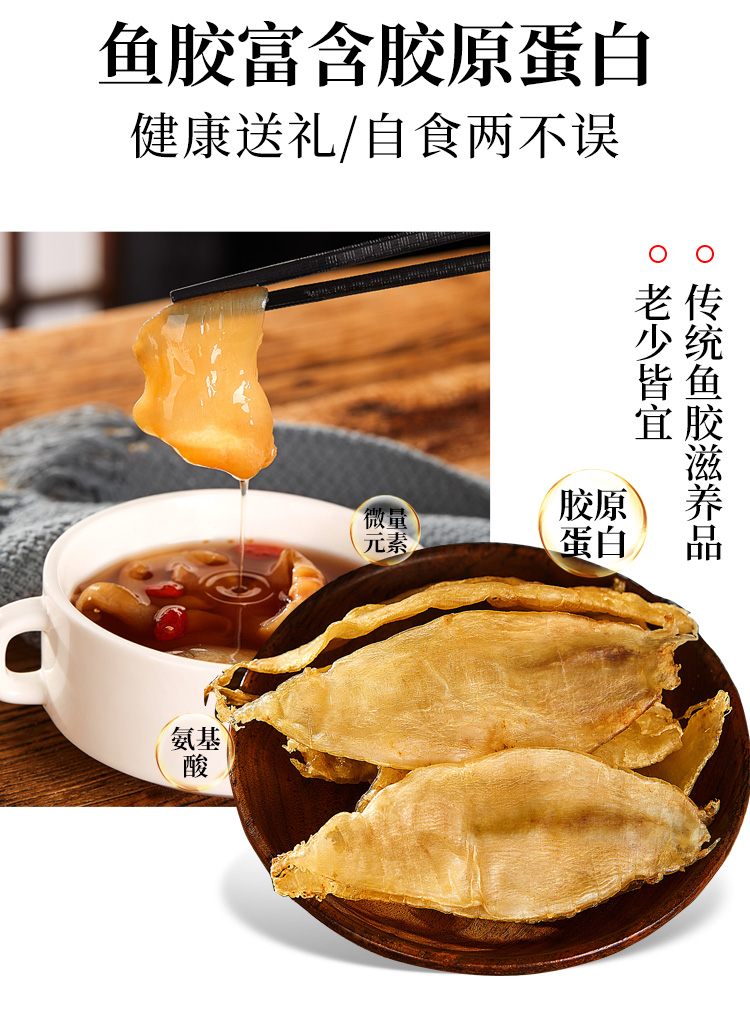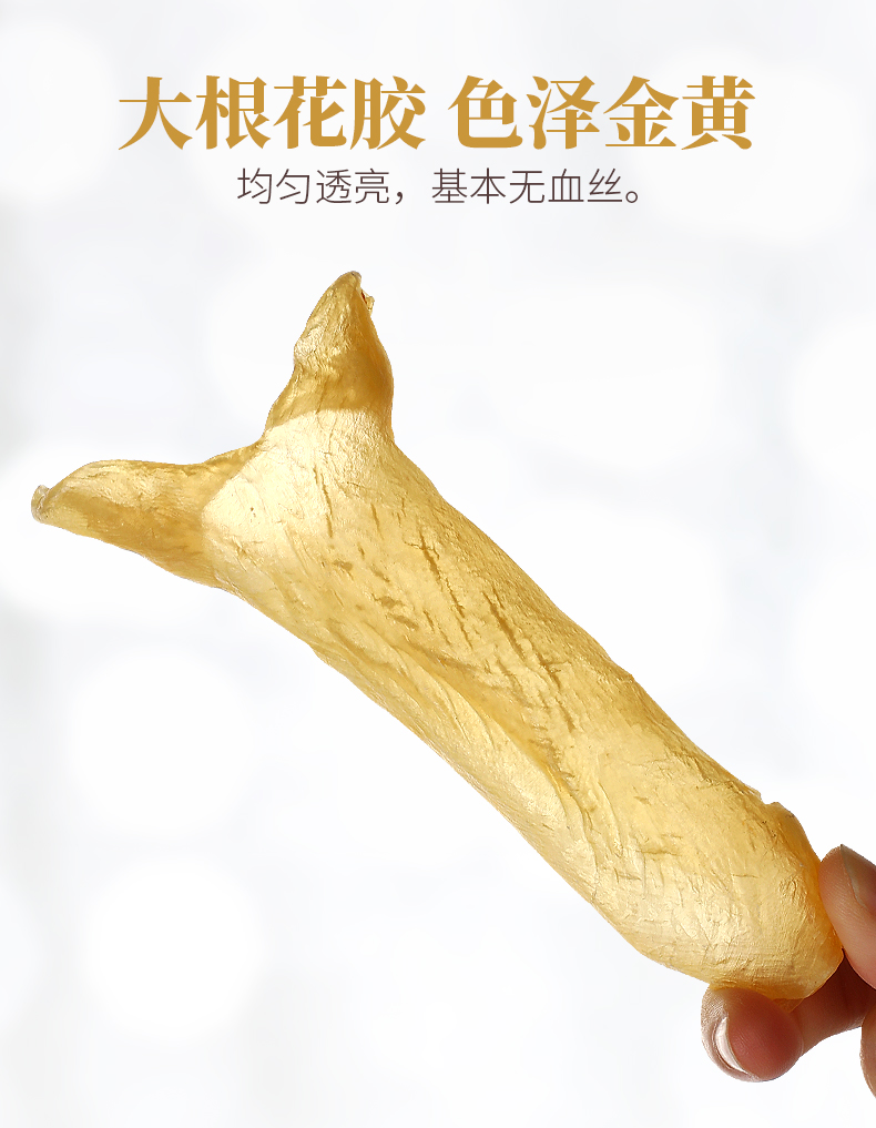 花膠即魚肚,是各類魚鰾的干制品,以富有膠質(zhì)而著名,故名為花膠?;z又名魚肚,是從魚腹中取出魚鰾,切開曬干后而成。花膠含有豐富的蛋白質(zhì)、膠質(zhì)等,食療有滋陰養(yǎng)顏、固腎培精之效,可令人迅速消除疲勞。頂級魚肚排名依次是魚膠之王:金錢鳘魚膠、白花膠、黃鱘膠、黃花膠、鳘魚膠?;z不僅是筵席名菜,還有相當(dāng)?shù)淖萄a價值。